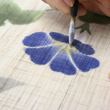 色々な種類の筆を使い絵柄を手で描いていきます。 手織りの麻生地には麻糸の太さや色の違いにより、色々な織目や濃淡があり、染料の濃度や染み具合などを見極めるには長年の経験が必要となります。手間を懸ければかける程、繊細で上品なのれんやタペストリーが仕上がります。